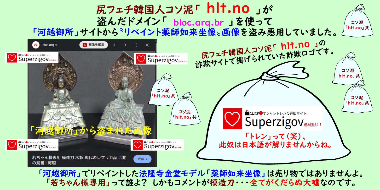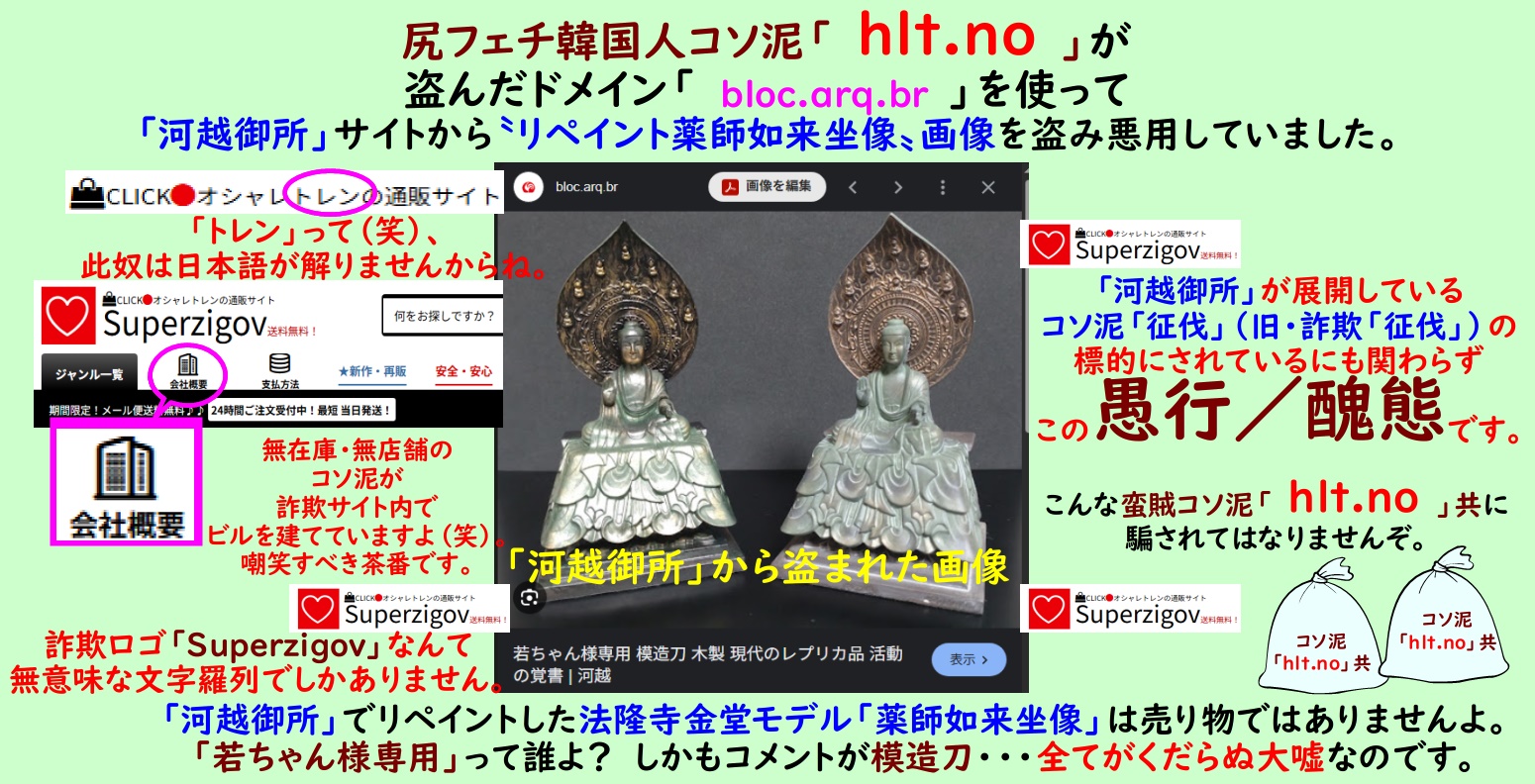 「河越御所」サイトに掲載されている品々(仏像・刀剣・建造物等々)を盗用している詐欺サイト/詐欺サムネイル画像がありますが、それらは「蛮族」韓国人詐欺師・詐欺ドメイン「 hlt.no 」の仕業です。