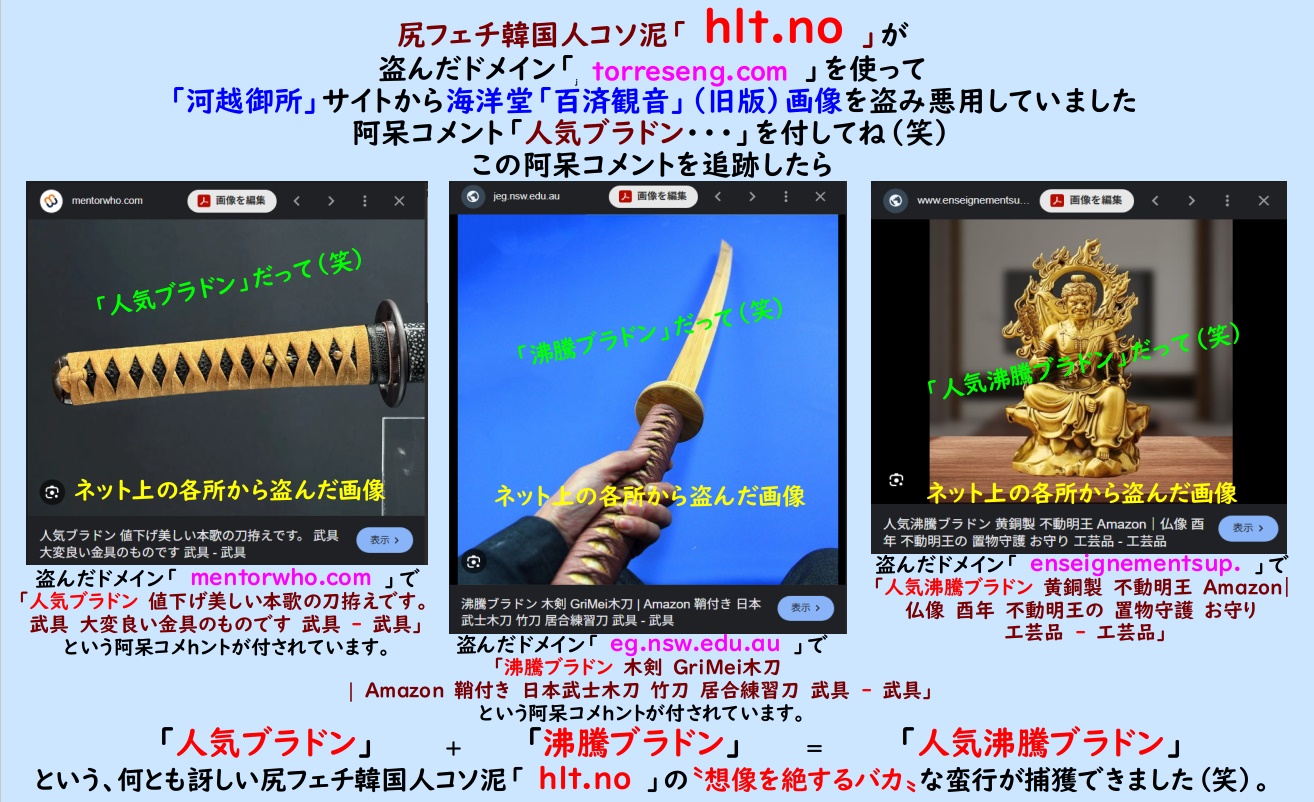 そもそも、尻フェチ韓国人コソ泥「 hlt.no 」共が、「河越御所」サイトから画像を盗んで詐欺サイトに悪用したことが事のんなのですよ。