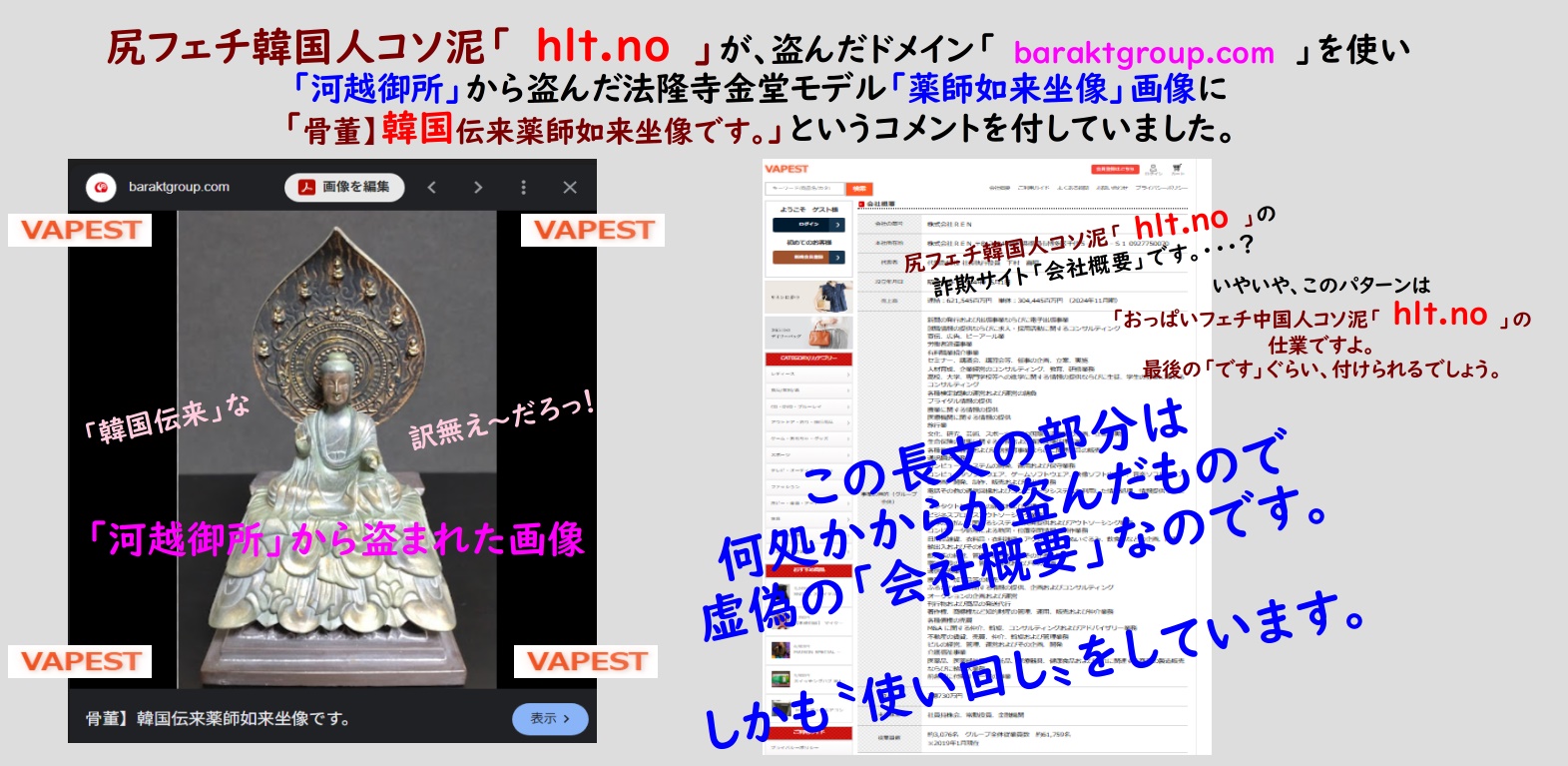 尻フェチ韓国人コソ泥「 hlt.no 」が盗んだドメイン「 baraktgroup.com 」を使い、「河越御所」サイトから盗んだ法隆寺金堂モデル「薬師如来坐像」画像に