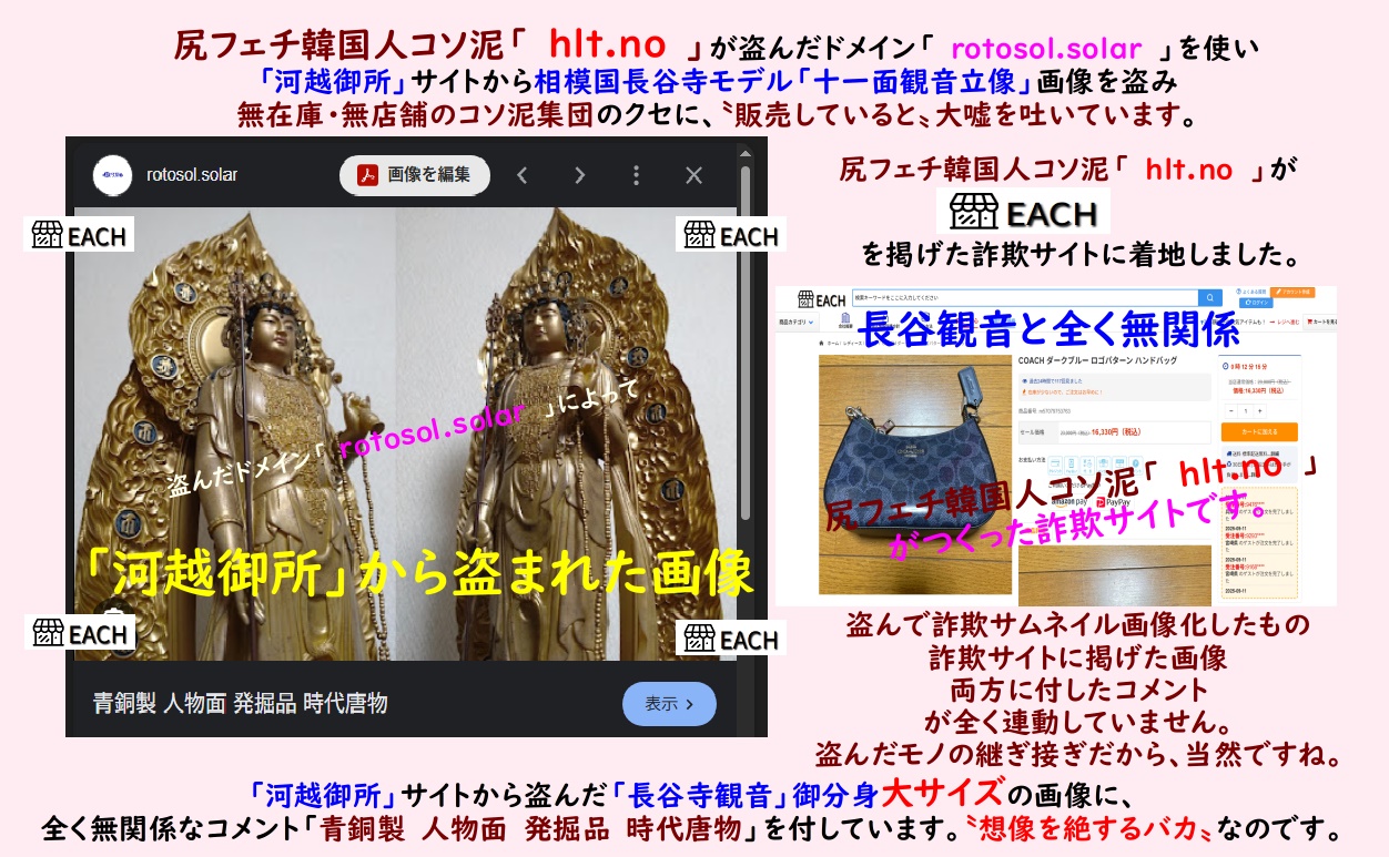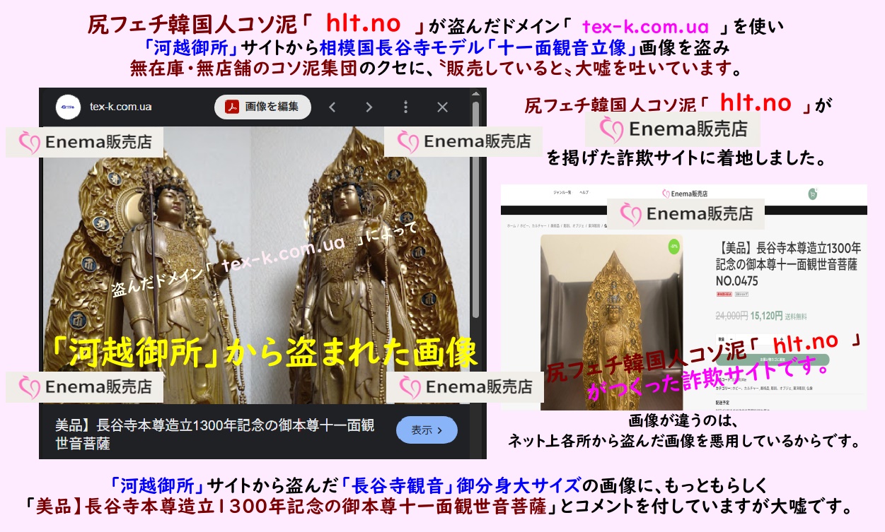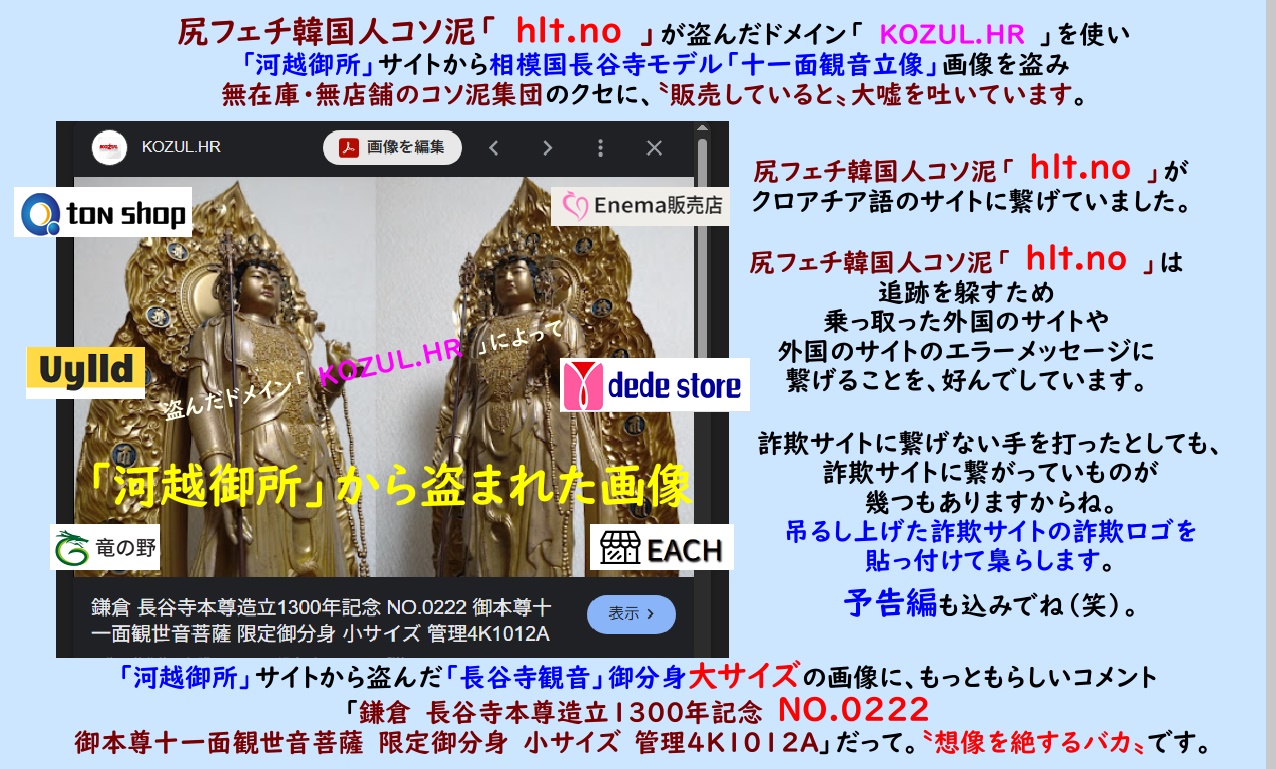「河越御所」では、尻フェチ韓国人コソ泥「 hlt.no 」等が、この期間限定販売に便乗して日本人を騙そうとする蛮行を祖師すべく、此奴等(コソ泥「 hlt.no 」共)が長谷観音の画像を盗用した詐欺サイト潰しを敢行しております。