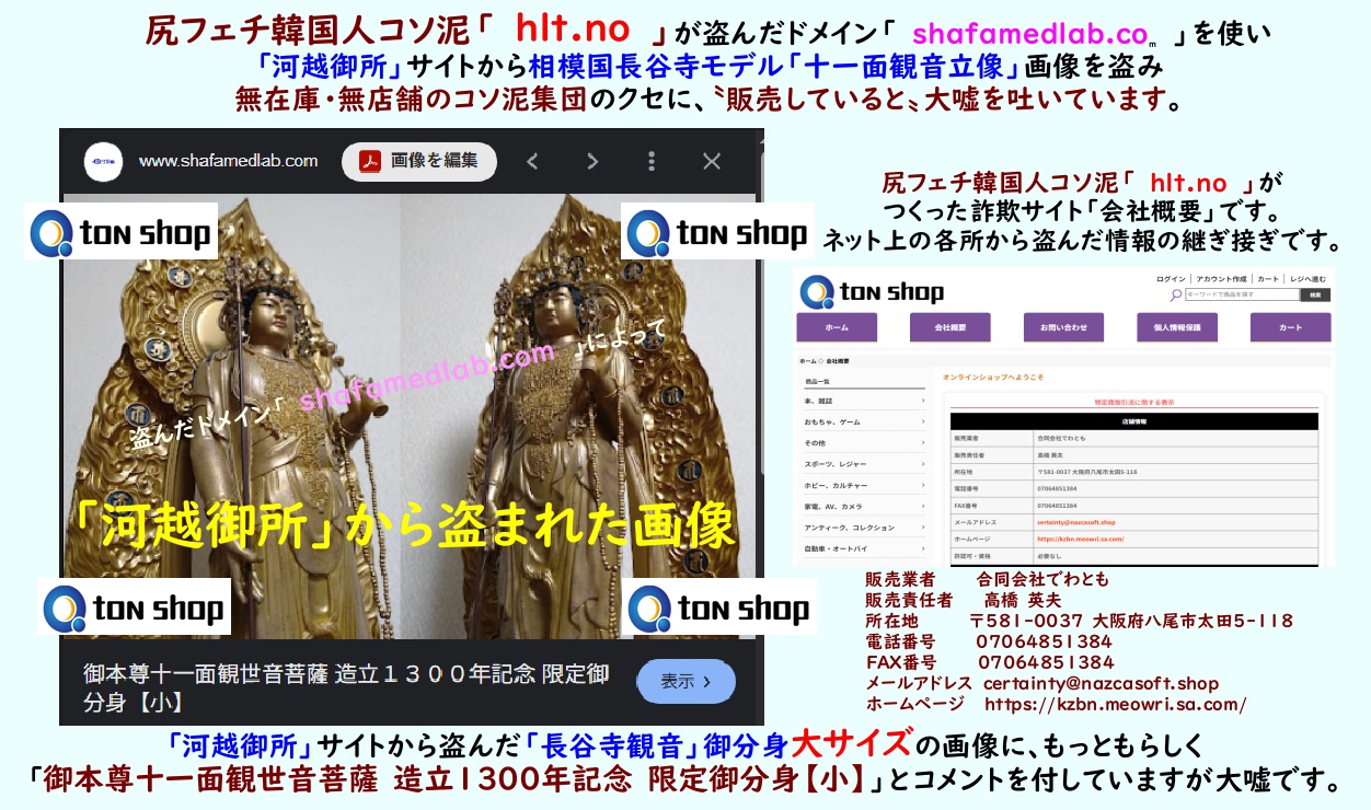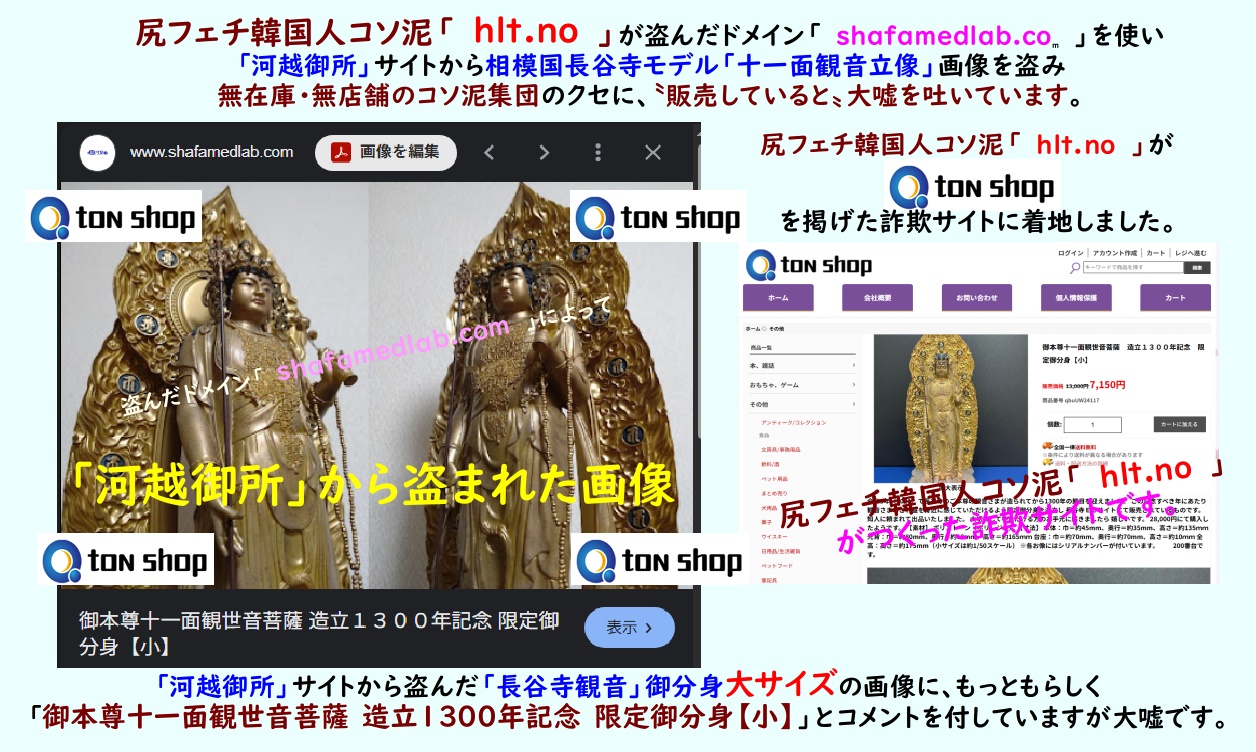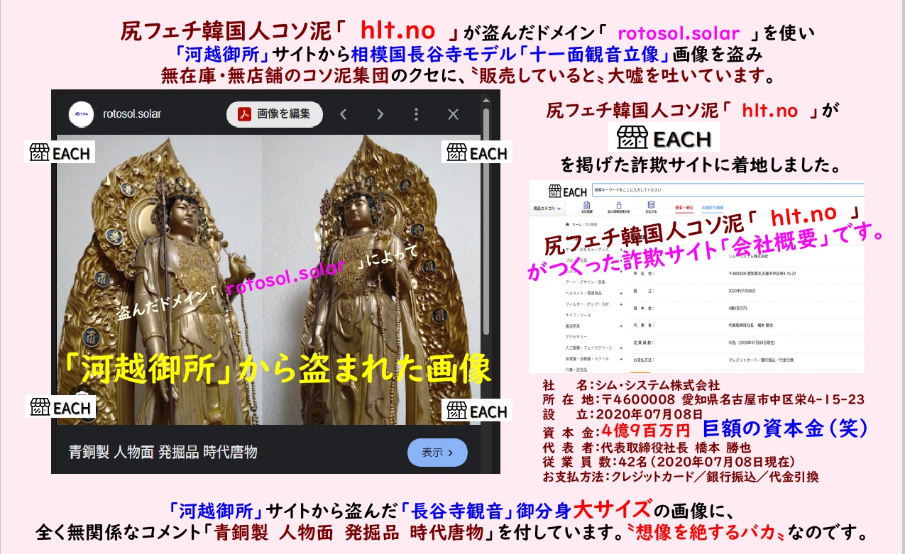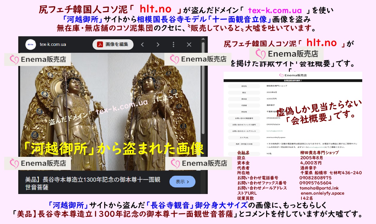 「河越御所」では、尻フェチ韓国人コソ泥「 hlt.no 」等が、この期間限定販売に便乗して日本人を騙そうとする蛮行を祖師すべく、此奴等(コソ泥「 hlt.no 」共)が長谷観音の画像を盗用した詐欺サイト潰しを敢行しております。