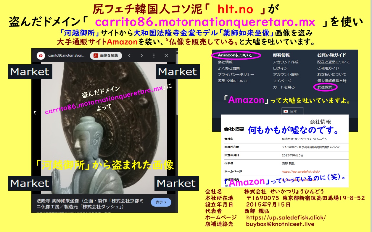 先ずはね、尻フェチ韓国人コソ泥「 hlt.no 」が無駄に長い、盗んだドメイン「 carrito86.motornationqueretaro.mx 」を使い、「河越御所」サイトから大和国法隆寺金堂モデル「薬師如来坐像」画像を盗んで「法隆寺 薬師如来坐像(企画・製作「株式会社京都ミニ仏像工房/製造元「株式会社ダッシュ」)」というコメントを付していました。