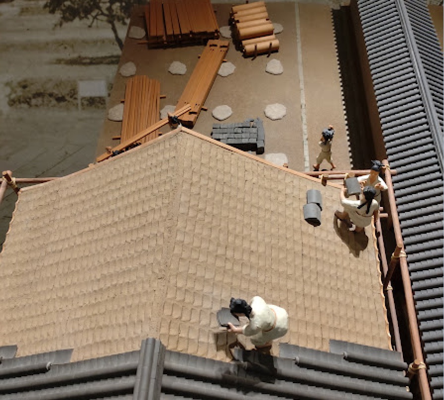 建物ができたら屋根に瓦を運び、手前では瓦を葺いています。