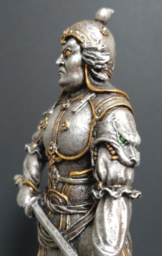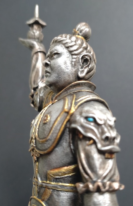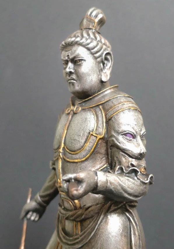「スペクトルお兄」さんに依頼したM-ARTSリアル仏像「四天王」の「リペイント改造」シリーズの第4弾、「増長天」のお姿ですよ。M-ARTSリアル仏像「四天王」は現在「イSム」ブランドのTanaCOCOROシリーズとして受け継がれています。「増長天」の表情はだいぶ本物(東大寺戒壇堂モデル)と異なっているのですが、シルバーを纏うことで、特に上から見た表情のカッコよさが際立っていることが判明しました。「スペクトルお兄」さんは数種類の銀色を塗り分けているので、四天王がそれぞれ華麗な姿に変身してしまいました。何とも嬉しい限りです。今回は4体セットということもあり、手間をお掛け致しました。恐縮です。「スペクトルお兄」さんは「群像としての統一感を意識しました、」と仰っていましたが、適度な遊び心を盛り込んでくれたので、単なる統一感ではない変化が備わっています。「四天王」個別の観察は今回で終了しますが、継ぎは4体を並べて観察する予定です。