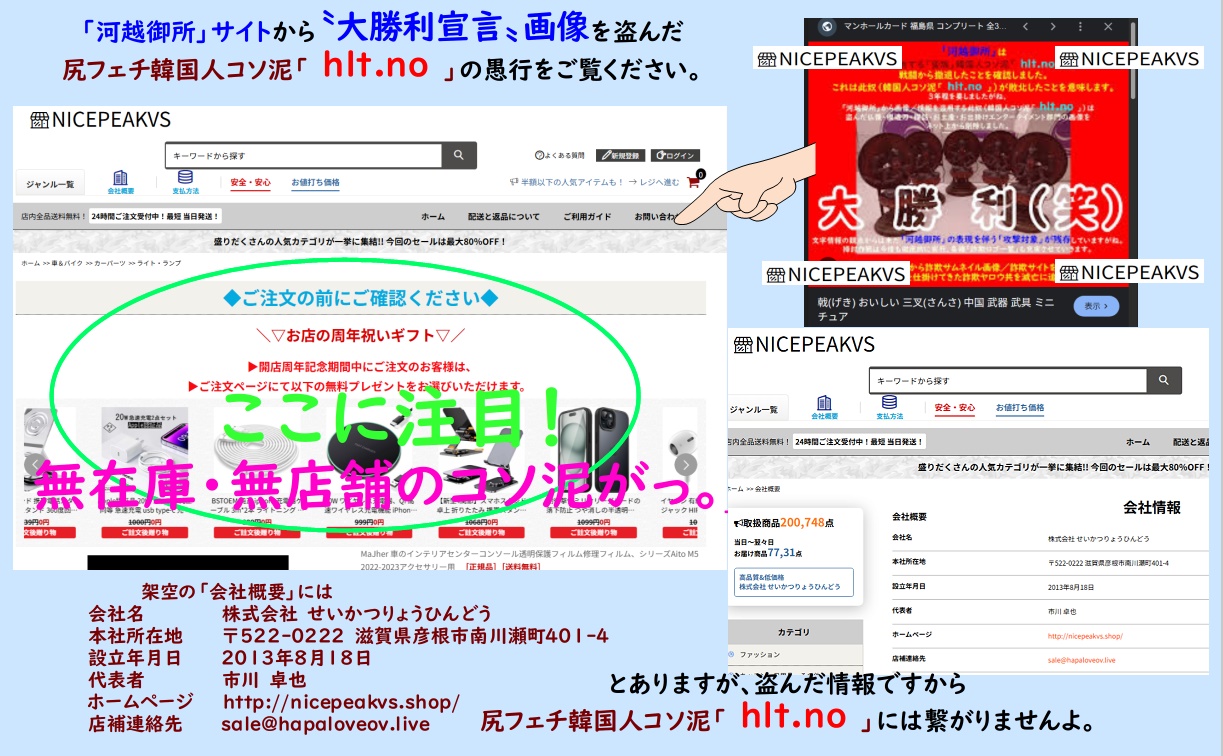 「河越御所」の詐欺「征伐」の様をご覧いただいた皆様、「河越御所」が暴いた詐欺集団の手口をご参照され、「蛮族」韓国人詐欺師・詐欺ドメイン「 hlt.no 」に騙されることの無き様にご注意いただければ幸いと存じます。