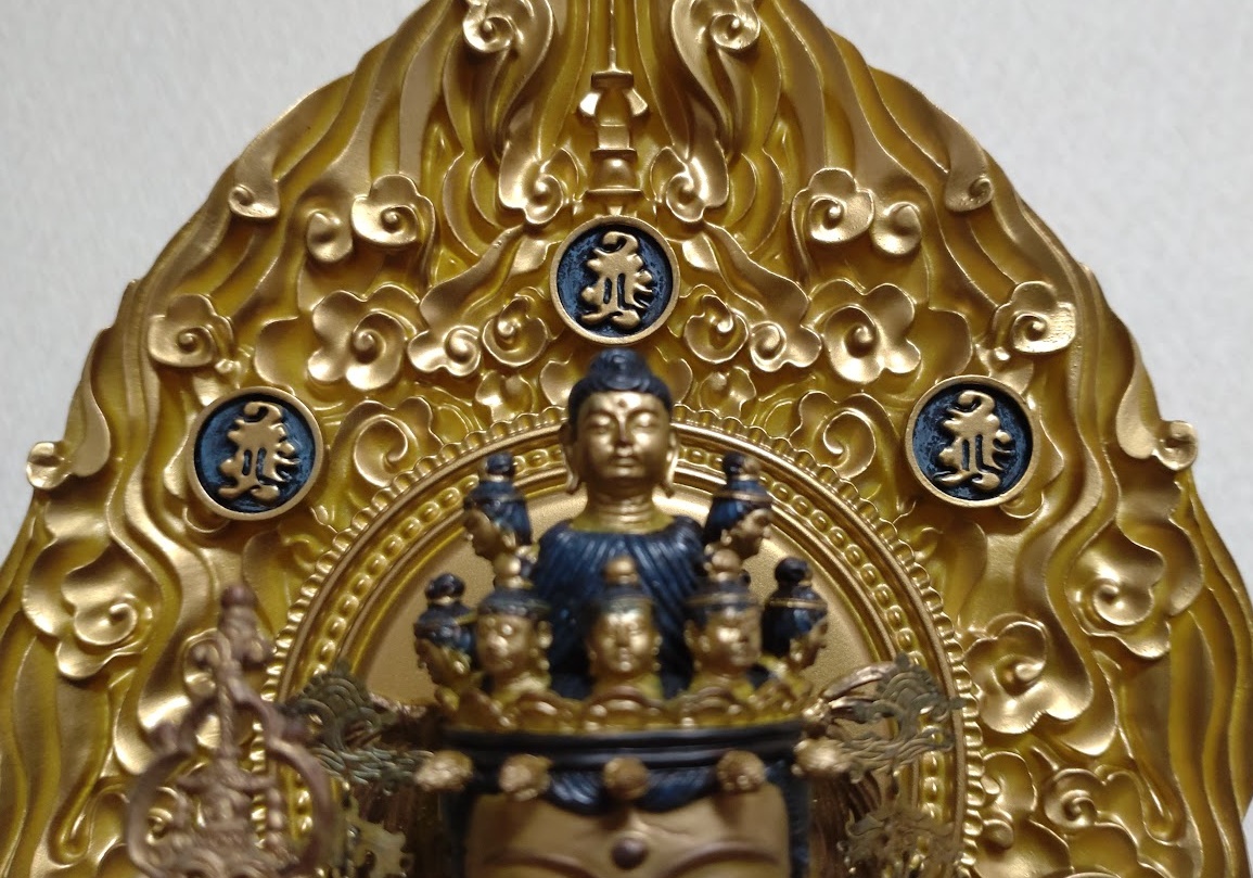 光背の存在感がかなりのものですが、天冠及び小観音の顔もまた緻密に再現されていますよ。