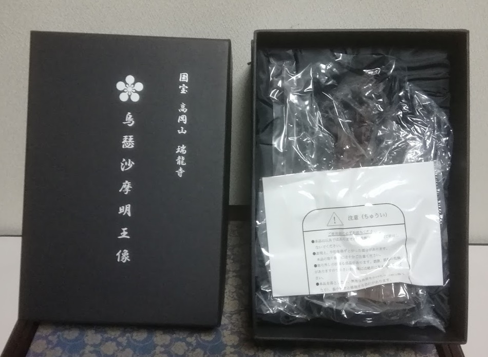 箱の蓋を開けると、注意書の下でビニール袋に入った烏瑟沙摩明王像の姿が見えてきました。