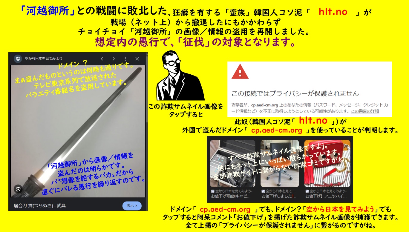 2024(令和6)年8月20日前後、「河越御所」は、狂癖を有する「蛮族」韓国人コソ泥「 hlt.no 」が「河越御所」との戦闘に敗北し、「河越御所」から盗んでいた画像をネット上から一斉削除をしたことを確認しました。