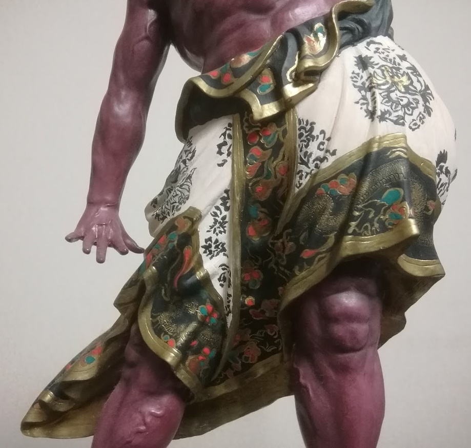 強い風が吹いている設定で、金剛力士・阿形の裳裾は右側へとたなびいています。