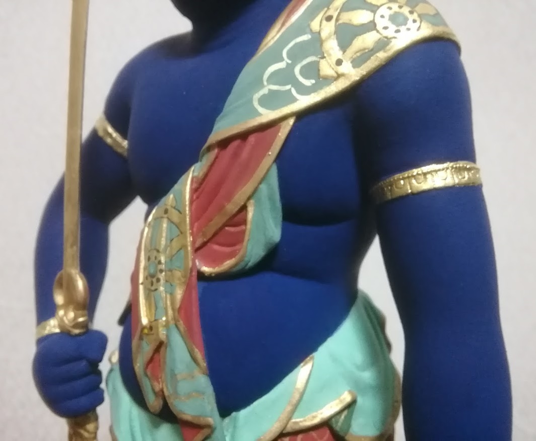 彩色師の篁千礼氏によって身体を群青に彩られた不動明王立像になります。