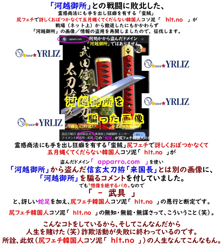 霊感商法にも手を出し狂癖を有する「蛮賊」尻フェチで訝しくおぼつかなくて五月蝿くてくだらない韓国人コソ泥「 hlt.no 」が、「河越御所」を騙っています。