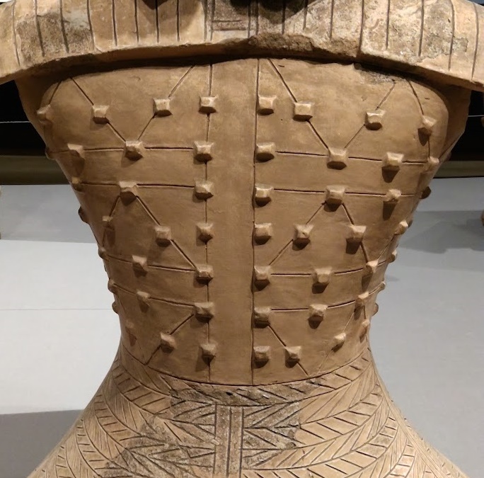 この2例は、摂津国の今城塚古代歴史館で観た復元された挂甲(けいこう)とは異なり、鉄板を鋲(びょう)で固定するものになっています。