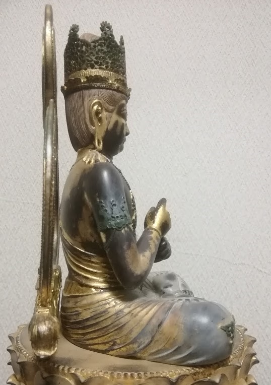 リアル大日の顔の金塗り部分が、本物の金箔残存状況をもとにしながらもダイナミックに再現していることが判ります。ディフォルメするにしても、金彩色が少ないよりも多い方が嬉しく、得した気分になります(個体差はあるのでしょうが)。これもまた楽しみ方のひとつでしょう。