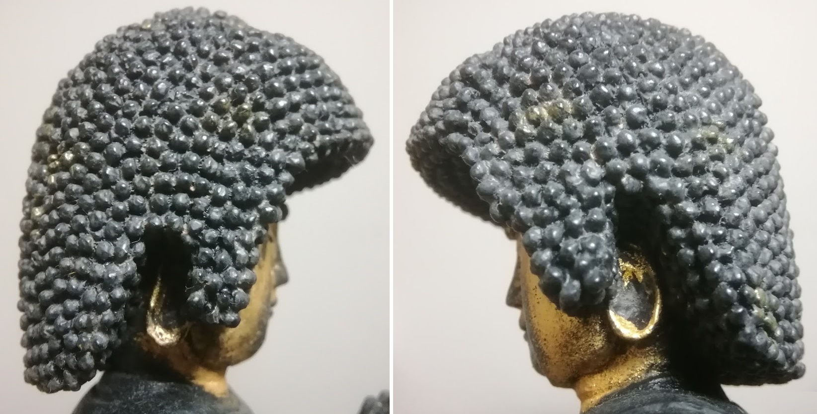 表情もそうですが螺髪や衣に施されている金の彩色に微妙な差異が見受けられます。
