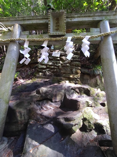 遙拝所と鳥居・祠の間を、岩盤を浸食した水が流れているのです。