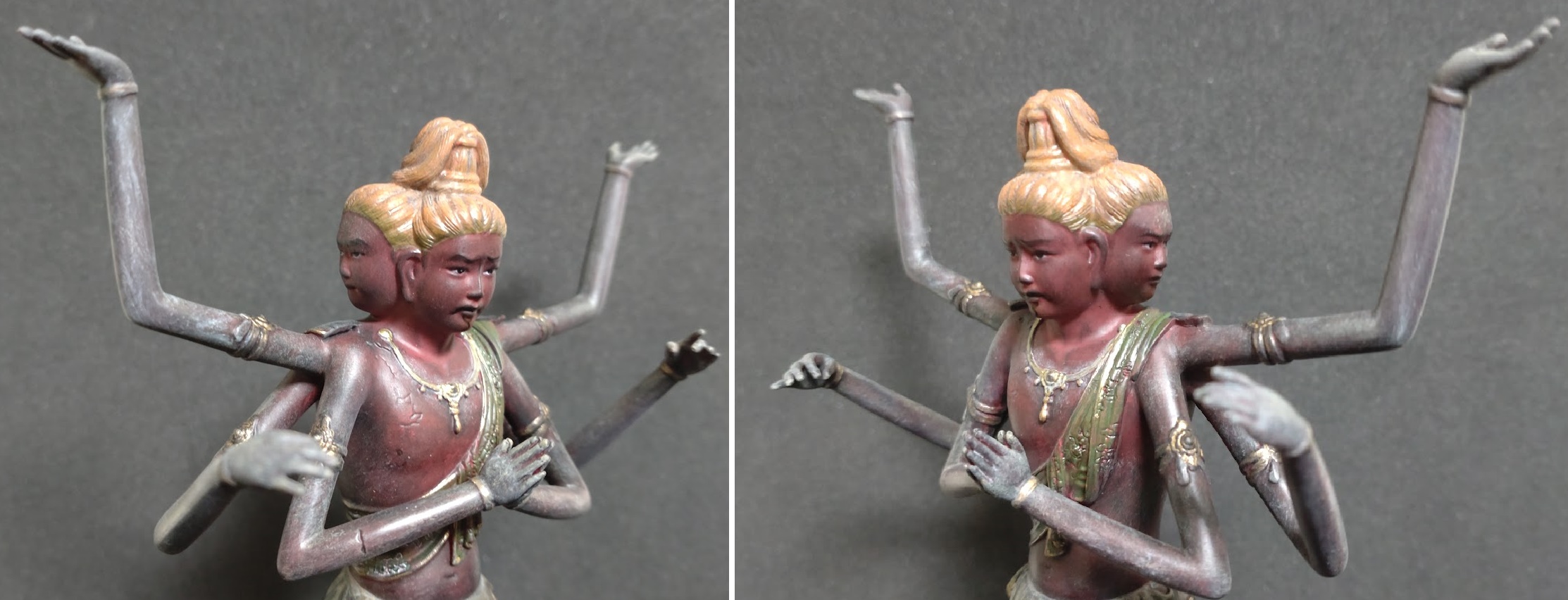 左右各3本の腕も、欠損・修繕を経て現在に至っていますが、左右対称ではありません。