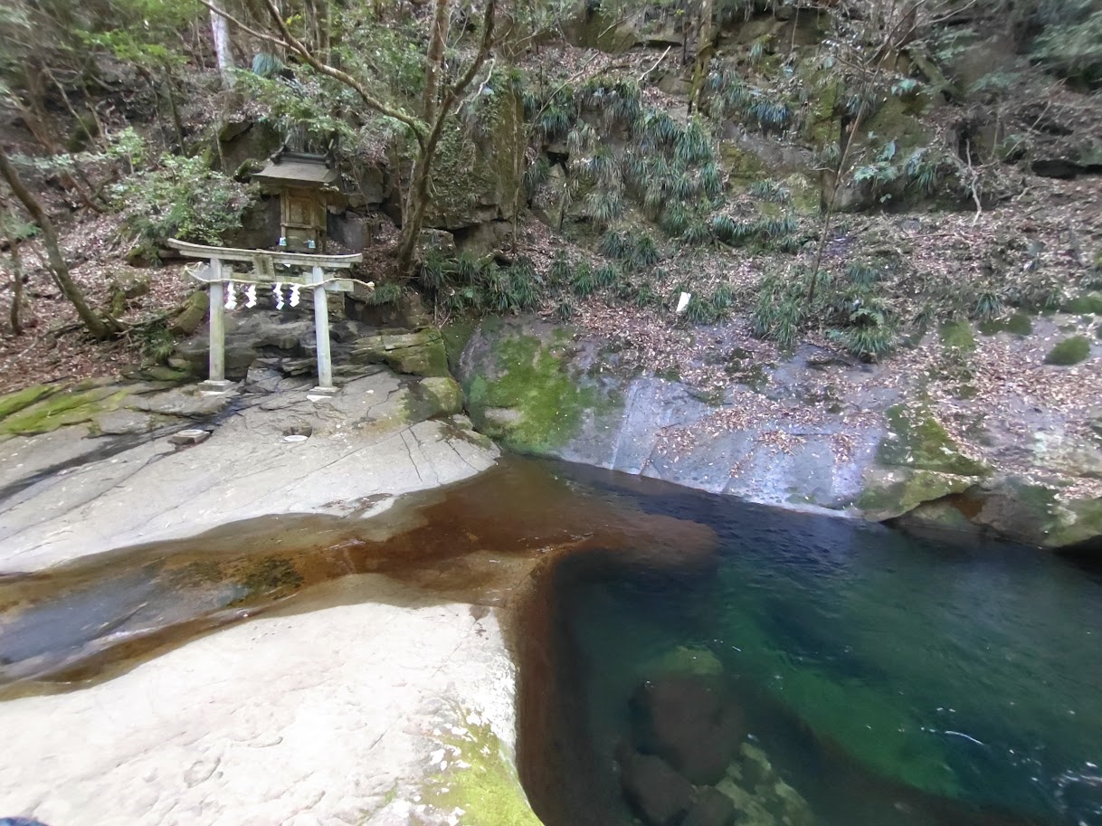 水面の様子は見えませんが「龍鎮の滝」と、鳥居・祠が収まった画像です。