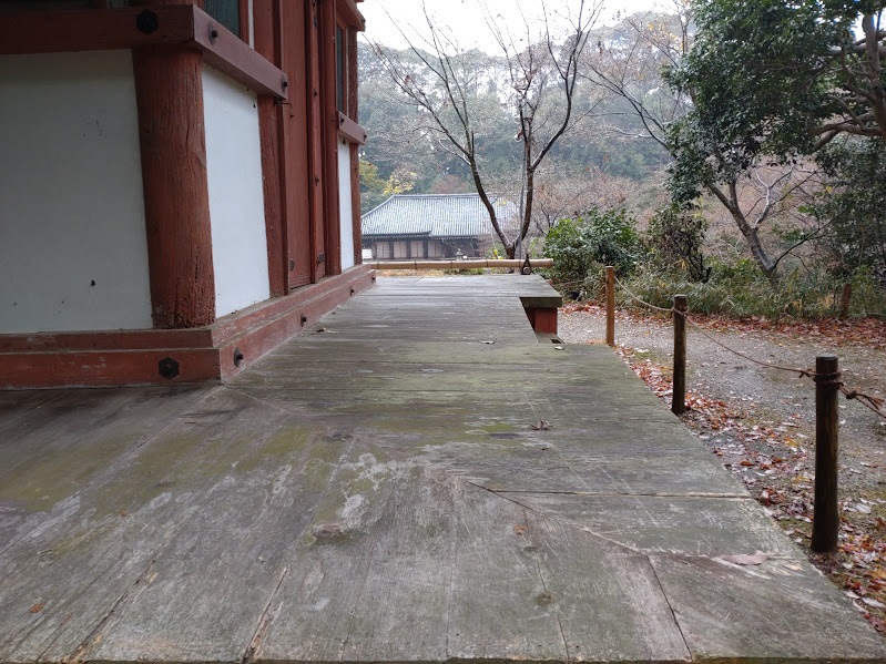 床板は、どこかの時代で交換されているのでしょうが(壁も塗り直しされているでしょうが)、頭上の軒先や左の柱は平安時代からの姿をそのまま保っています。