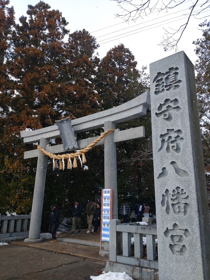 「鎮守府八幡宮」に到着したら小雪が舞い、本殿の辺りに居た時は晴れていて、境内から出るところで雪が強くなりました。