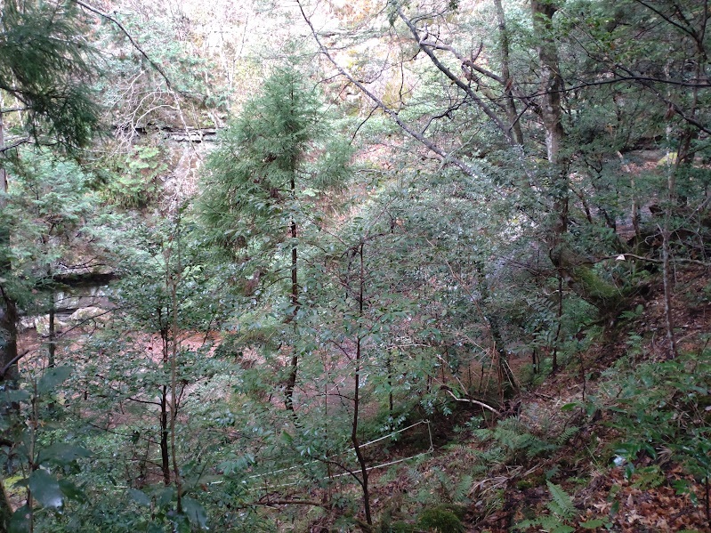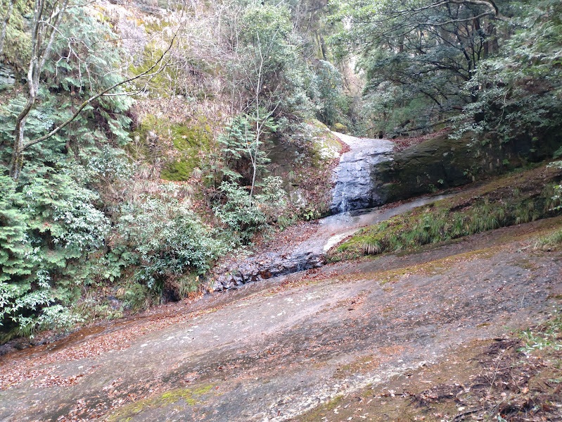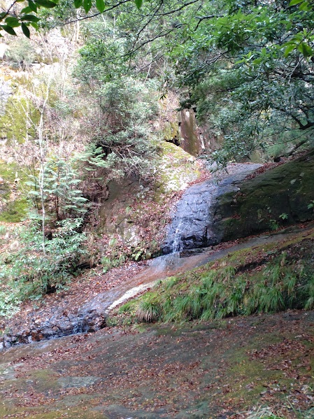常緑樹によって見え辛くなっていますが、現場では岩盤を水が流れている様子が見えています。