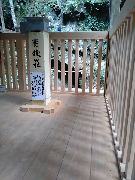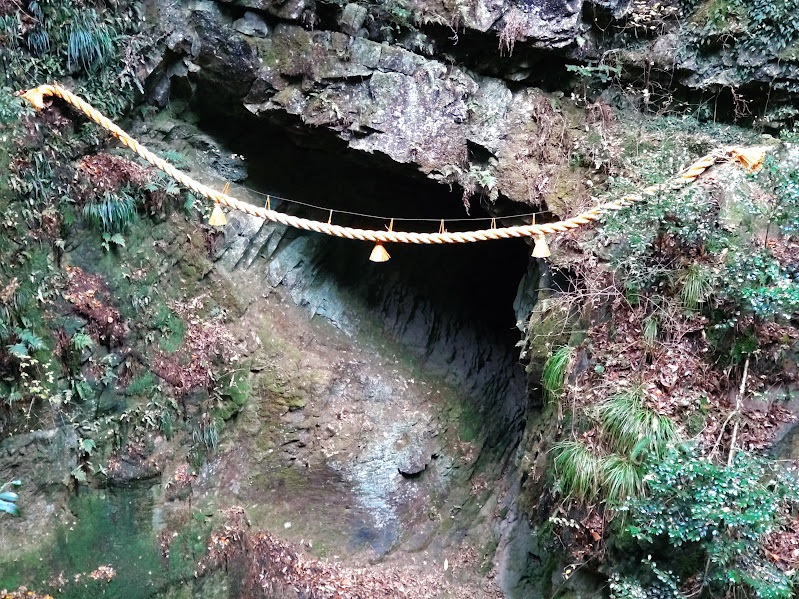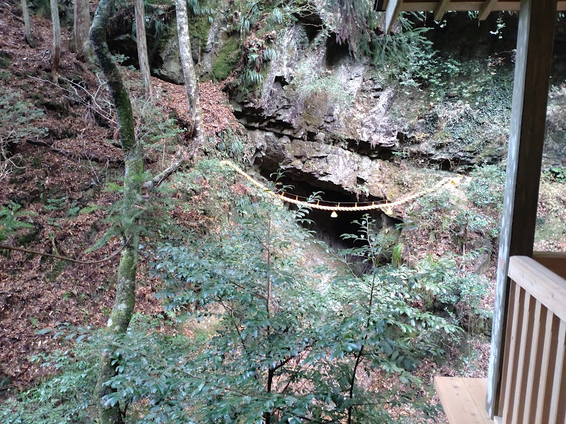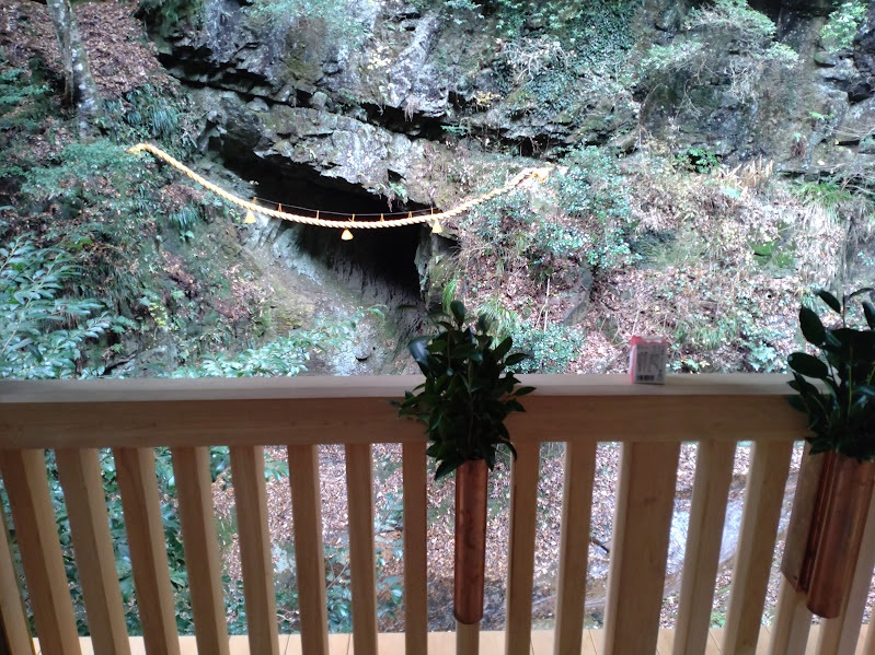 遙拝所の向こう側に、龍穴に張られた注連縄が見えています。