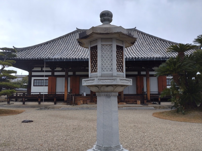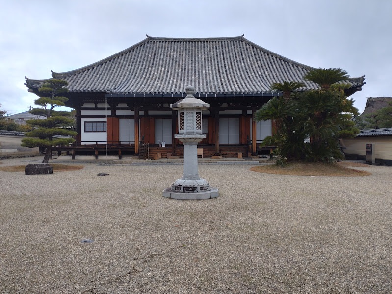 石灯籠越しに法華寺「本堂」を見ています。