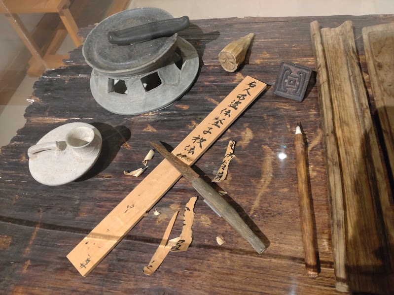 官吏の仕事ぶりが判る展示で、木簡のリサイクル状況を再現していました。