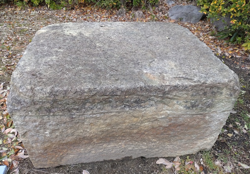 この礎石は1935(昭和10)年の来生橋(らいせいばし)改修工事の際、佐保川の右岸より平城京羅城門の礎石4個が発見されたそうです。