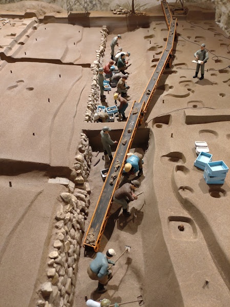 遺跡の状況が判明したら、場所によってはこのジオラマの様に土を運び出す機械を導入することもあります。