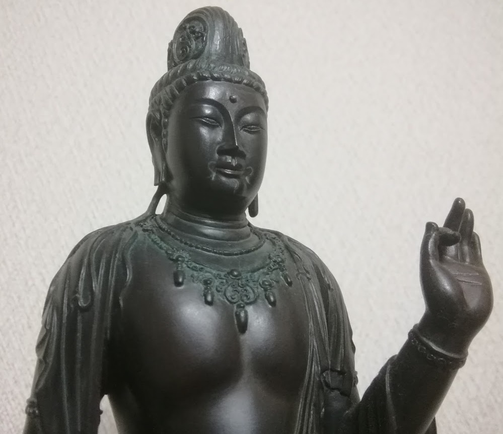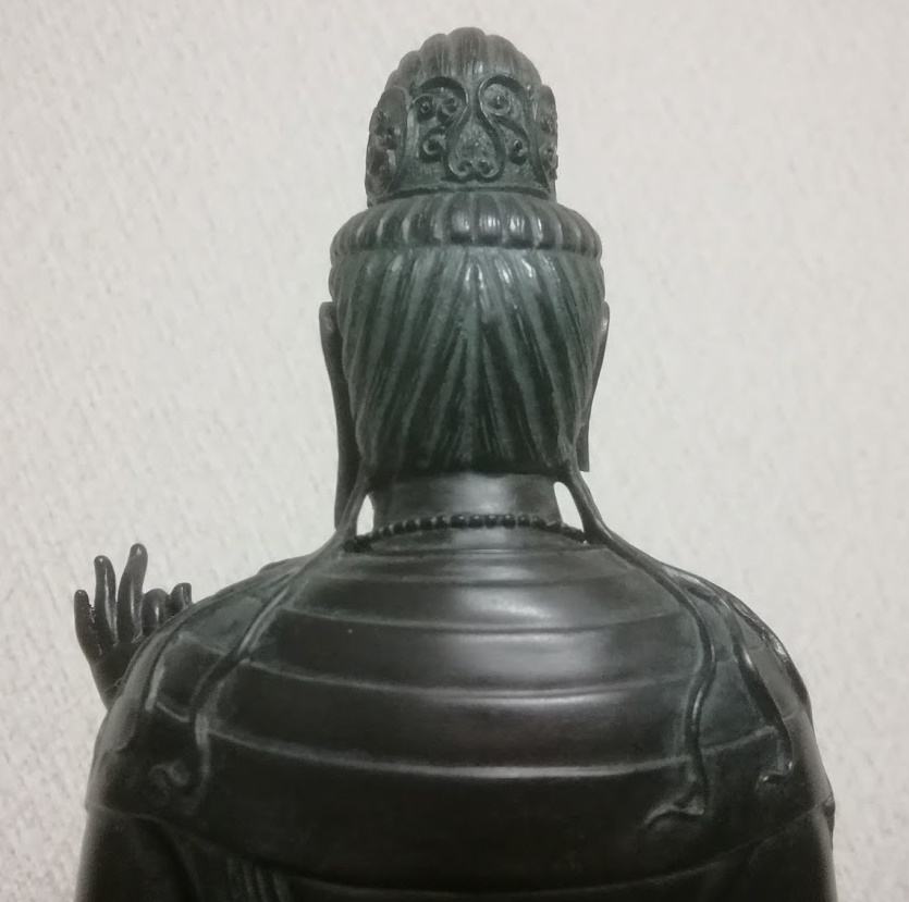 本物は、頭上の宝髻(ほうけい)前の基部にある小さな角枘孔(かくほぞあな)に化仏(けぶつ)が取り付けられていたとが推測されています。イSム「観音菩薩」では、その角枘孔は再現されていません。
