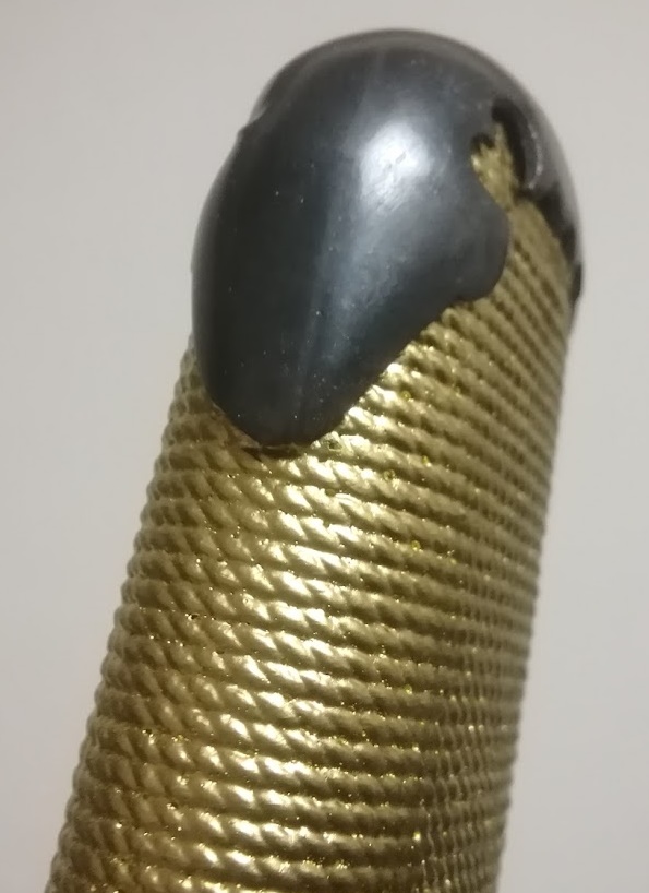 鞘の先っちょには本物が装着する金具をイメージした「球状鍬型金具」(きゅうじょうくわがたかなぐ)が据えられています。