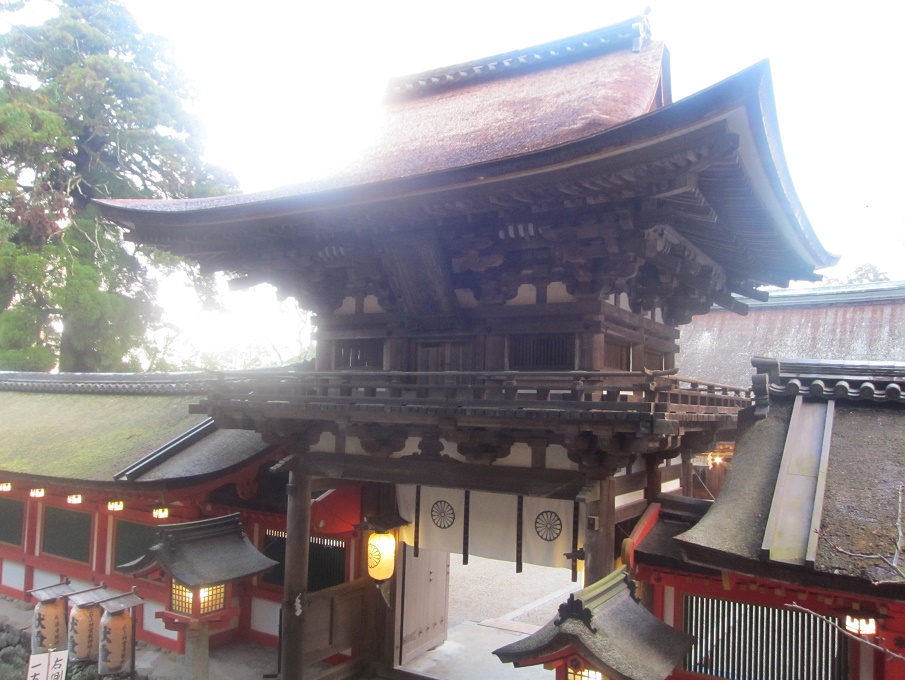 高台からの視点です。楼門を行き過ぎたところ、東回廊から拝殿、そしてちらりとですが本殿の屋根が見えています。拝殿前からですと、本殿はちょうど後ろ側に位置しているため全く姿を見ることができません。チラッと見えただけでも有り難いことです。