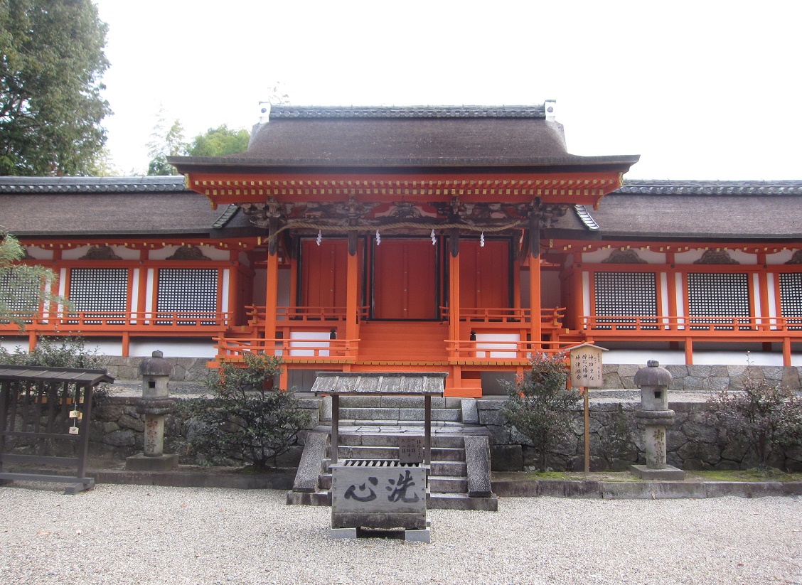 中央の三間社流造(さんげんしゃながれづくり)の社殿に、八幡三神が安置されていました。国宝に指定されている八幡三神は現在、奈良国立博物館に寄託されているそうです。