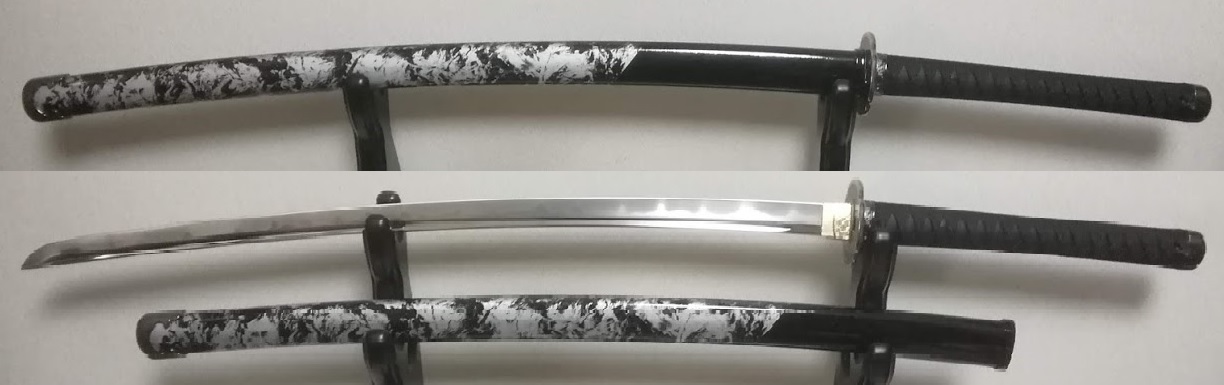 武装商店の店主様・美術刀担当様と話をしている中で、「金の切返鞘も格好良いし、銀の切返鞘も素敵だし、両方をお願いして共に黒散らしをかけてもらいたいのですが、二振りはほぼ同じなので悩むんですよね・・・」と相談したら、「表裏で金銀にするのは?本歌でも作例がありますよ。」という助言をいただき、早速発注をしてもらいました。