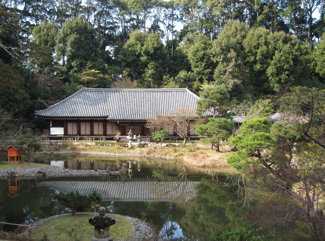 三重塔の階段を降りながら、〝此岸・彼岸の境界〟である宝池越しに本堂の姿を見ています。日が差しています。これがまた、いい雰囲気なのですよ。
