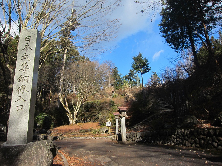 「日本武尊銅像入口」の碑が。画像中央部に集中すると小さくですが日本武尊(やまとたけるのみこと)の姿が見えます。