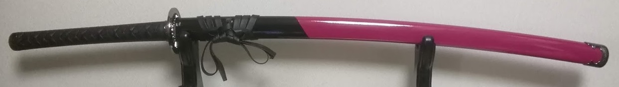 柄は長めの薩摩柄、下地が黒合皮で目貫はありません。この柄には大車輪鍔がピッタリと合います。柄巻は美術刀用の黒合皮、下緒も同様の物としていただきました。ショッキングピンクが短刀の色とほぼ同じです。薩摩柄の柄頭に合わせて黒の鍬型鐺を装着させたことでピンク色の甘いイメージに支配されずに全体が引き締まりました。