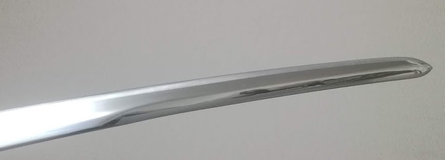 アルミの小烏丸刀身で、全体の1/3が切先諸刃造となっています。この作例では切先諸刃の長さは指定無しのお任せでした。刃文の変更はできません。アルミ刀身なのでとても軽量です。勿論、振り回したりはしません。