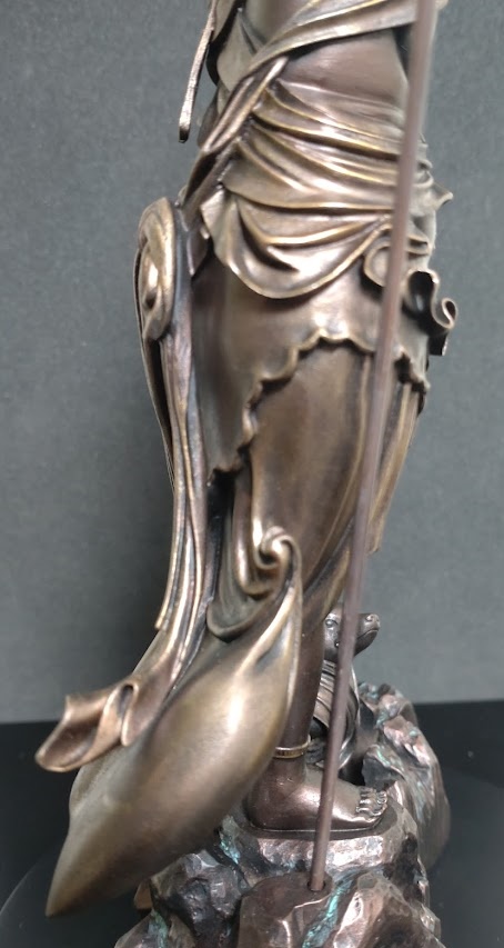 身体の部分は銅色ですが、丁寧に陰影がつけられ、あまりしつこくない絶妙な差し色として緑青(りょくしょう)が入っています。この画像ですと首元、胸の飾り・瓔珞(ようらく)の周辺ですね。