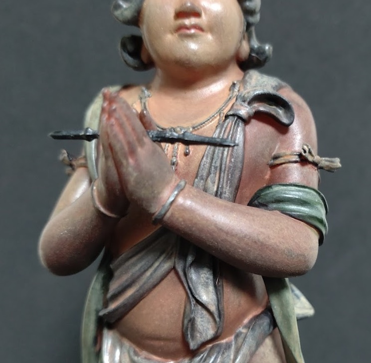 本物ですと、顔・胸元が退色など汚れが顕著なのですが、イSム矜羯羅童子は逆に本物の汚れが強いところを明るめの彩色とし、薄い汚しで矜羯羅童子の表情が明るいものとしています。