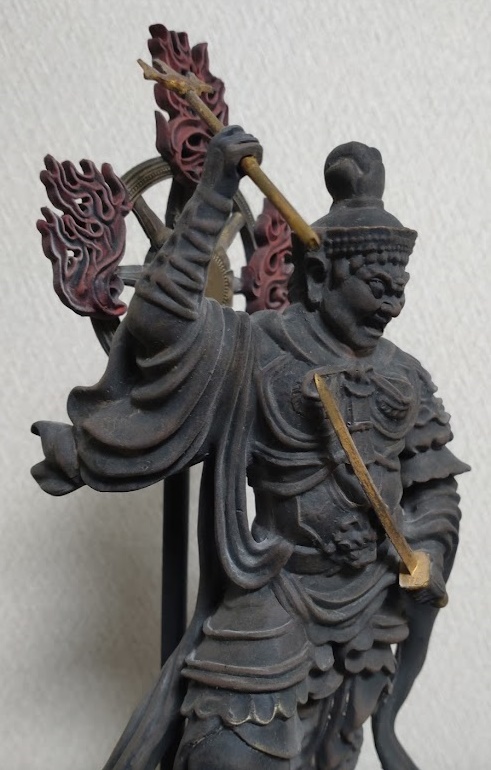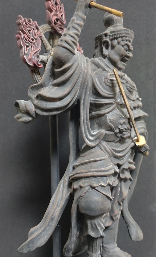 両手に法力を有する武器をそれぞれ持ち、両足で邪鬼を踏んでいますが、左右で足の状態を変えています。その上で着衣のたなびきで静止彫像とは思えない躍動感をたたえています。