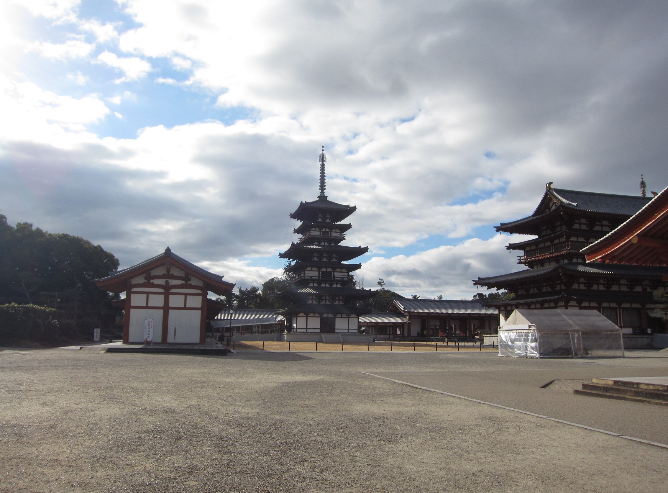 2019年時点では解体修理とはいっても、この覆いの内側ではだいたい組み上がっていたことでしょう。手前に西塔と同様に幟(のぼり)が立っていました。何かイベントがあったのでしょうね。