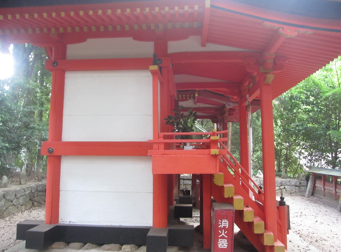 摂社の春日神社は柱・壁が共に経年でくすみ・剥げがあります。