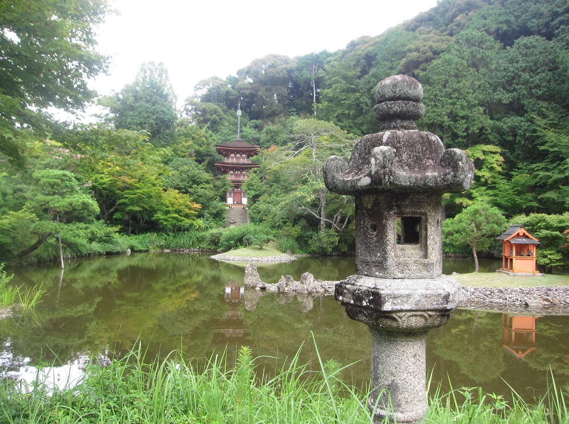 「本堂」前の石灯籠越しに「三重塔」を見ています。
