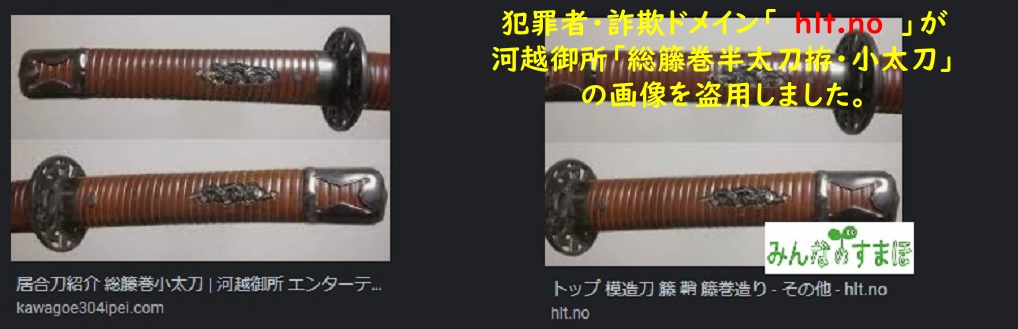 そもそも売り物ではない、当御所の改造「柄下地フェイクファー半太刀」を恰も販売しているかの様に振る舞っている詐欺ドメイン「 hlt.no 」は、中古品を「新品」と偽り、「半太刀拵」を「太刀拵」と大嘘をこいている犯罪者なのです(笑)。此奴、悪意と無知の二重奏を以て世の人びとを騙そうとしているのですよ(笑)。