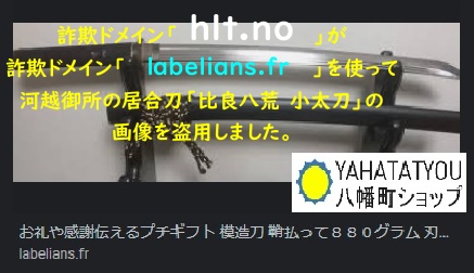 犯罪者・詐欺ドメイン「 hlt.no 」は別の詐欺ドメイン「 labelians.fr 」を使って、当御所の「幅広二本樋同田貫刀身 比良八荒(小太刀)」の画像を何度も何度も盗用しています。