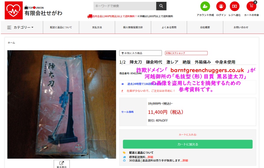 で、詐欺ドメイン「 barntgreenchuggers.co.uk 」が、当御所の「毛抜型(形)目貫 黒呂塗太刀」の画像を盗用したことを摘発しました。