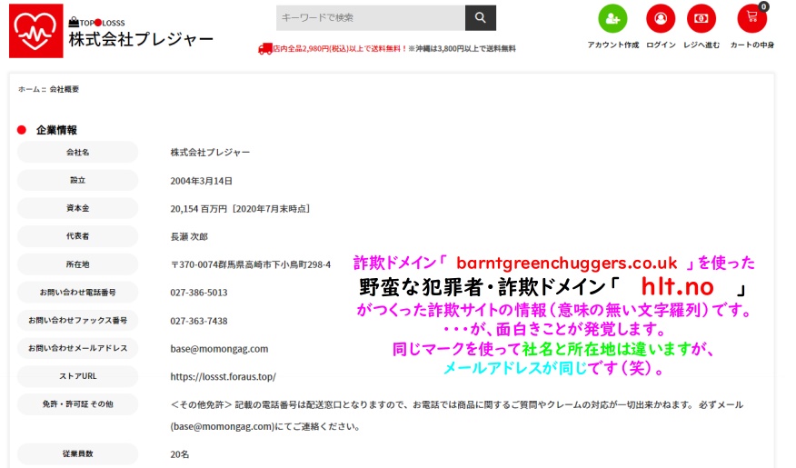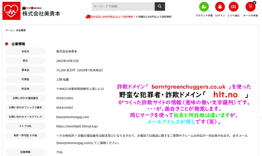 初めて〝詐欺「征伐」エンターテイメント〟に触れた皆様、野蛮な犯罪者・詐欺ドメイン「 hlt.no 」は既存の会社名をこの様にセンスの無いベタ打ちで盗み、その他の情報もどっかから盗んで詐欺サイトをつくってしまう悪癖があるのです。因みに此奴(詐欺ドメイン「 hlt.no 」)、詐欺ヤロウですよ。