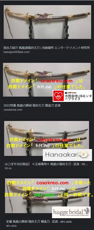 詐欺ドメイン「 casakrea.com 」、当御所がサイトに掲載した掌・伐折羅(旧版)の転回画像、そして「鳳凰頭衛府太刀」の画像を盗用した事例から詐欺ドメイン「 hlt.no 」の仕業であることが確定しています。今一度、ご覧いただきましょう。