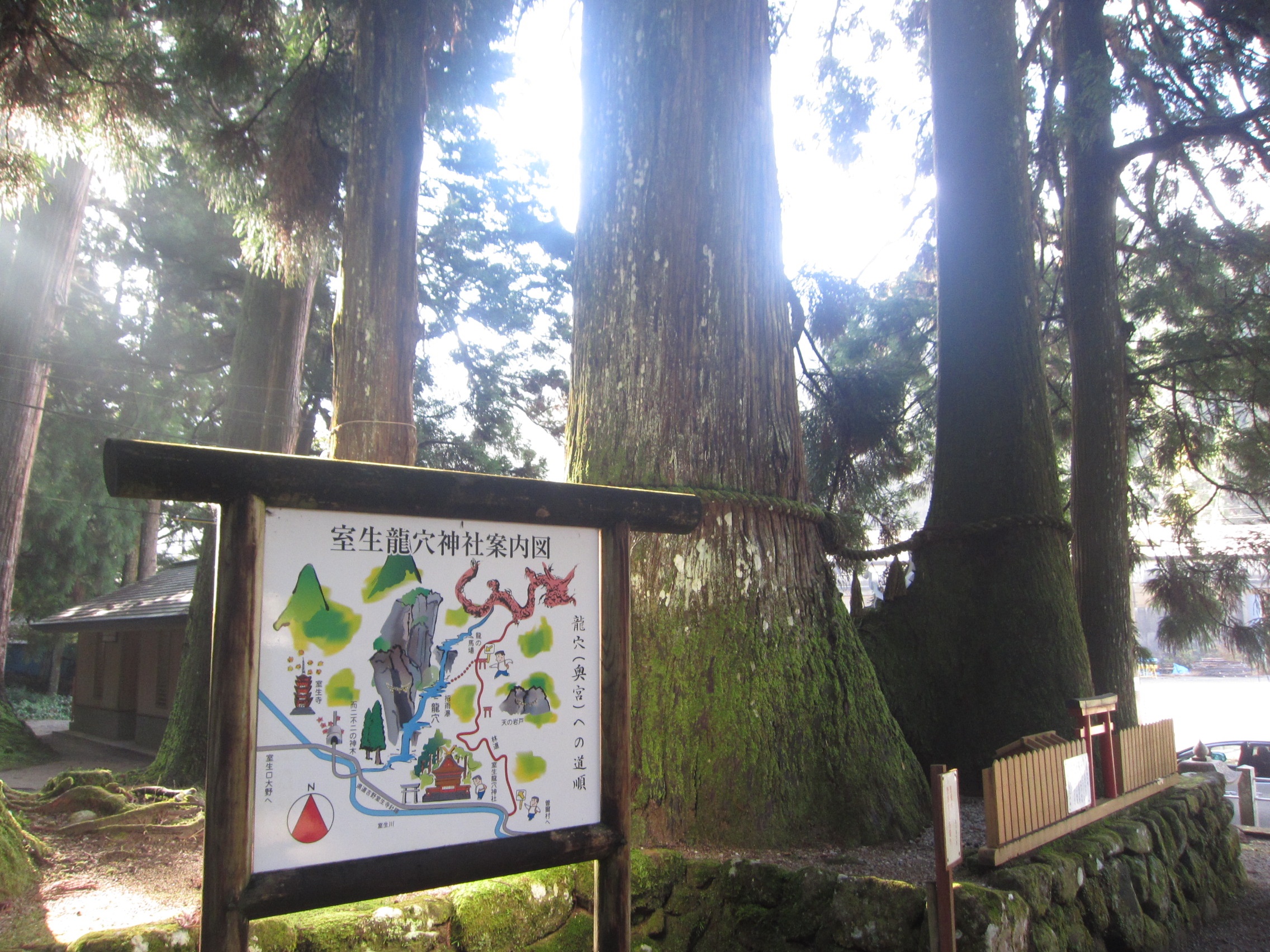 「連理の杉」の横っちょに、「四神」のイラストを入れた「案内図」が立てられています。